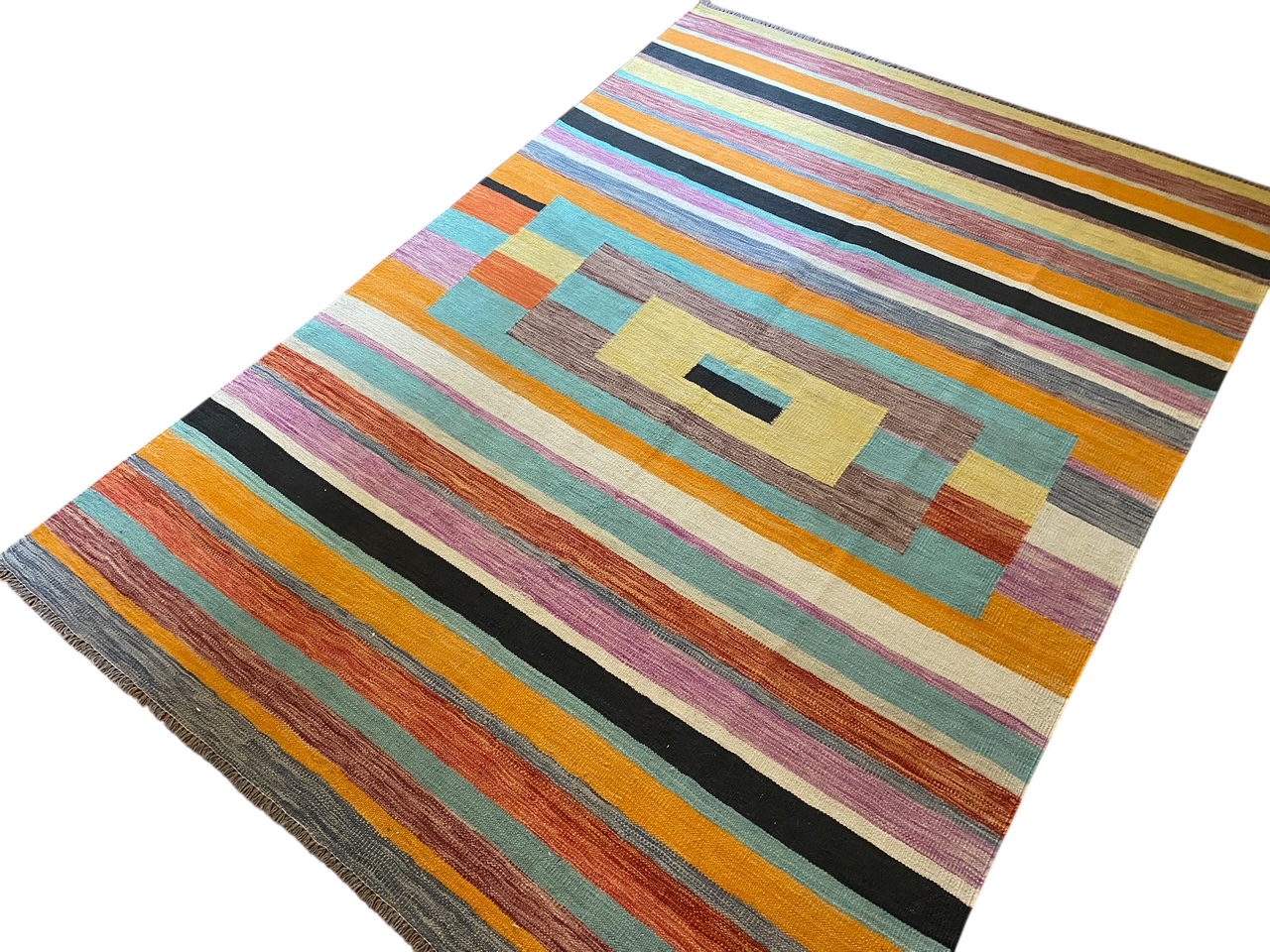 Jeder Teppich ist ein Unikat – gefertigt aus handgesponnener Schurwolle und mit natürlichen Pflanzenfarben gefärbt. Das moderne, geometrische Design mit leuchtenden Farbstreifen in Orange, Türkis, Violett, Schwarz und Gelb schafft eine lebendige und zugleich harmonische Atmosphäre.