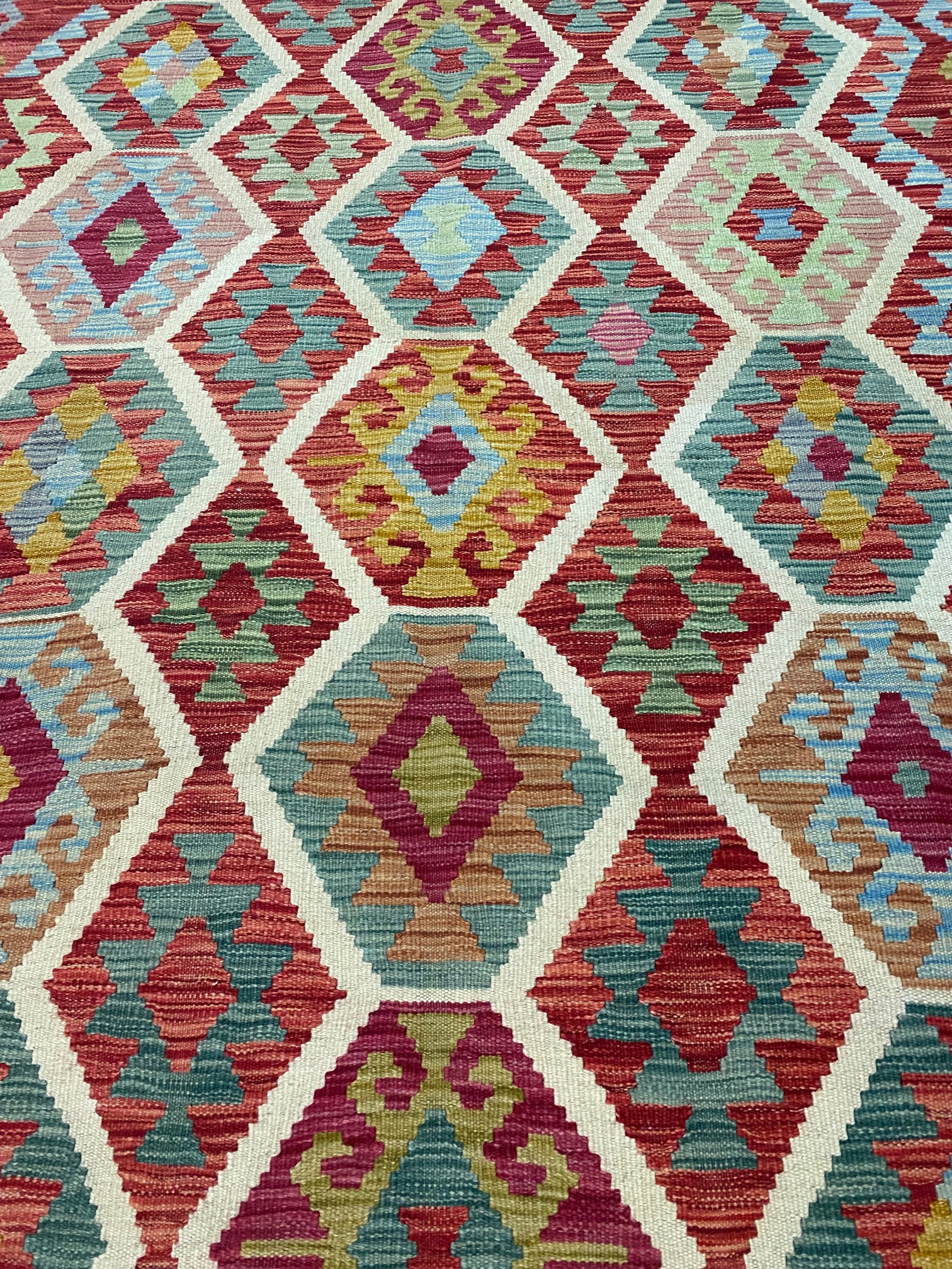 Dieser wunderschöne Kelim stammt aus Afghanistan und wurde in traditioneller Handarbeit gefertigt. Er besteht aus reiner Ghazni-Wolle – einer der hochwertigsten Wollsorten der Region, bekannt für ihre besondere Strapazierfähigkeit und weiche Haptik.