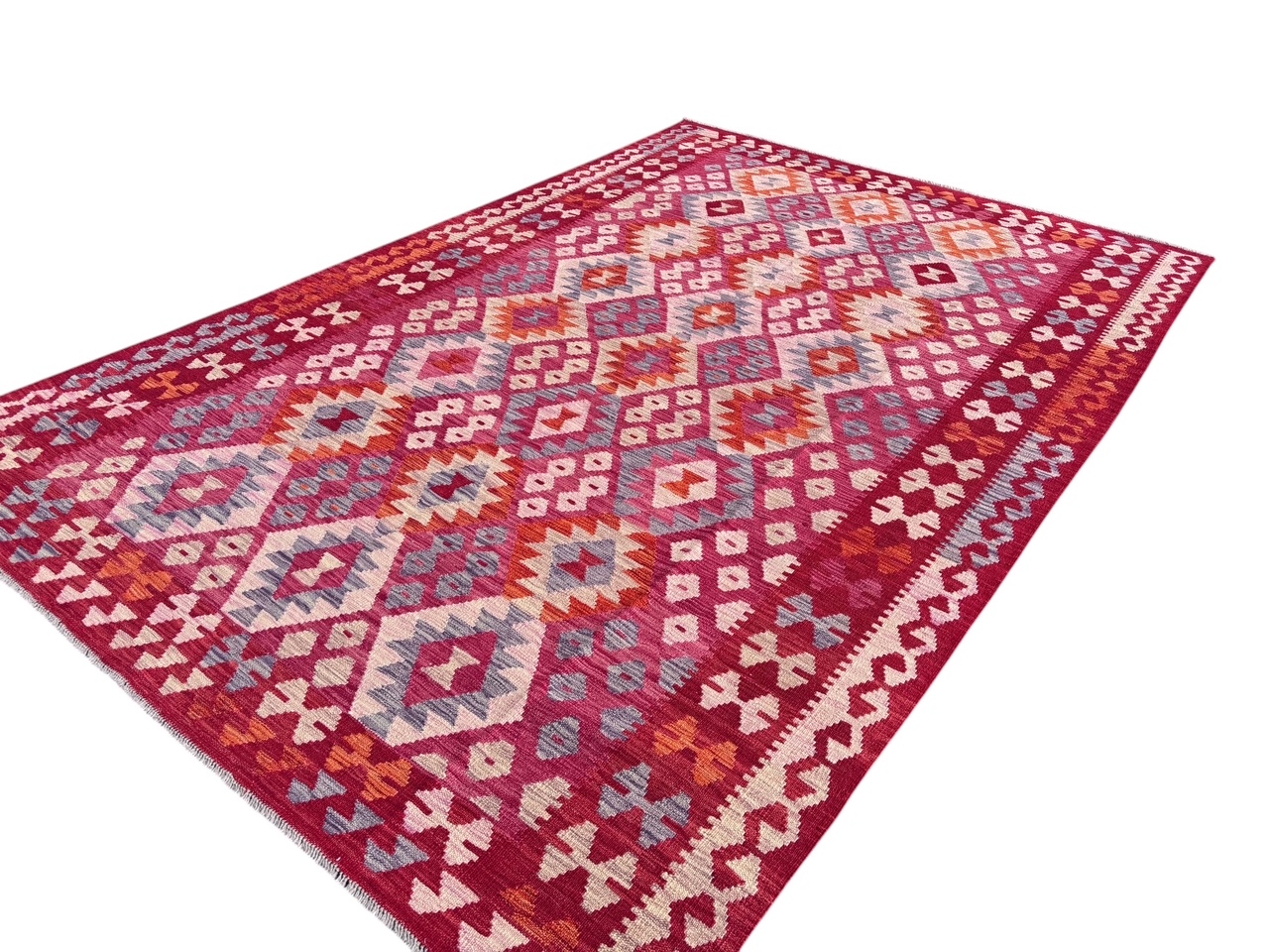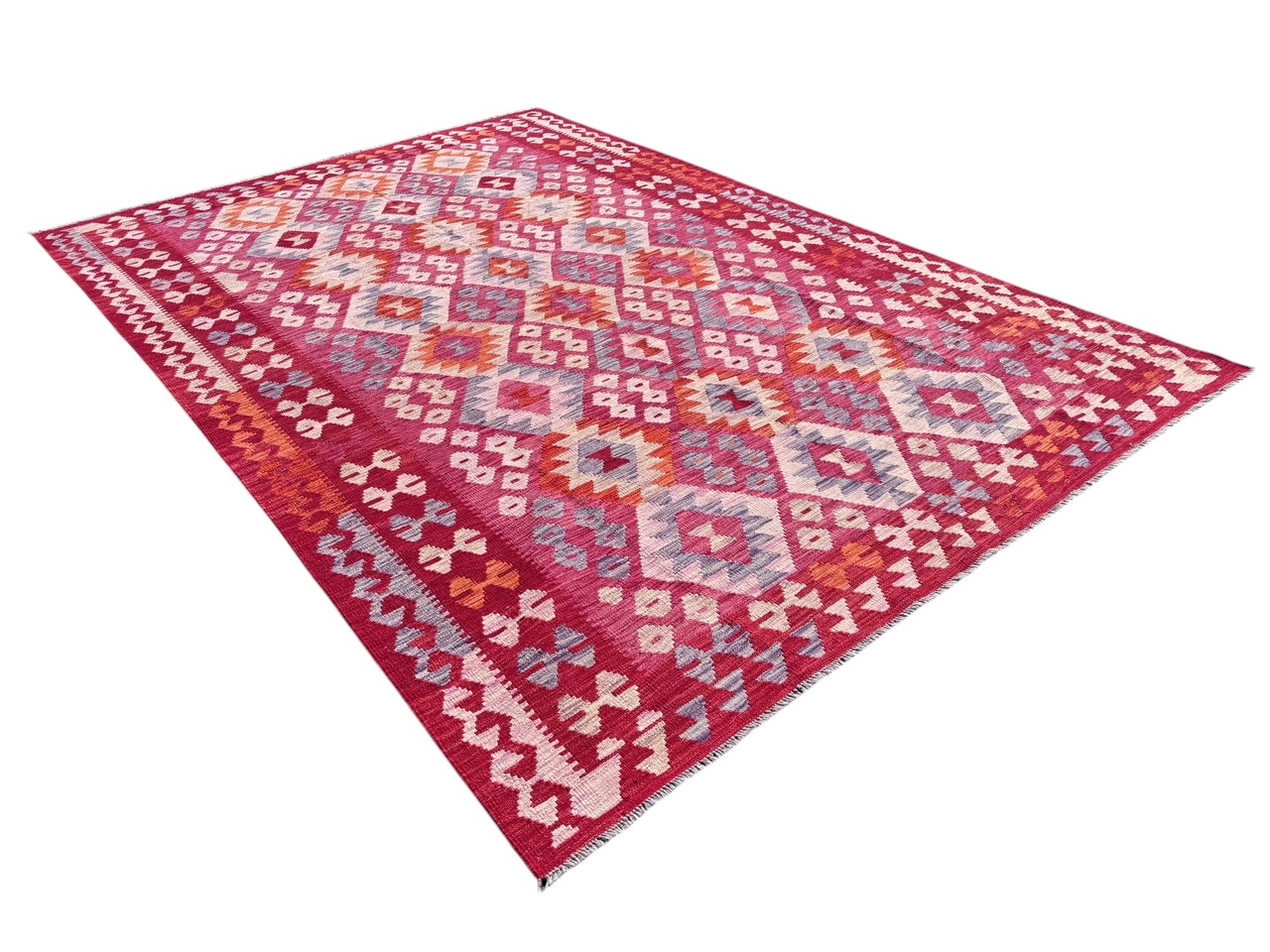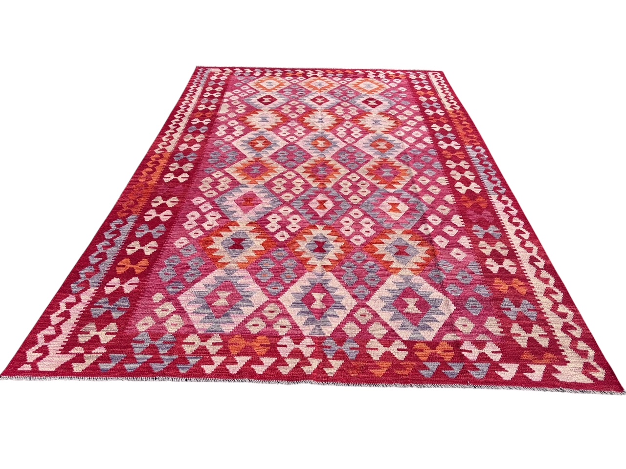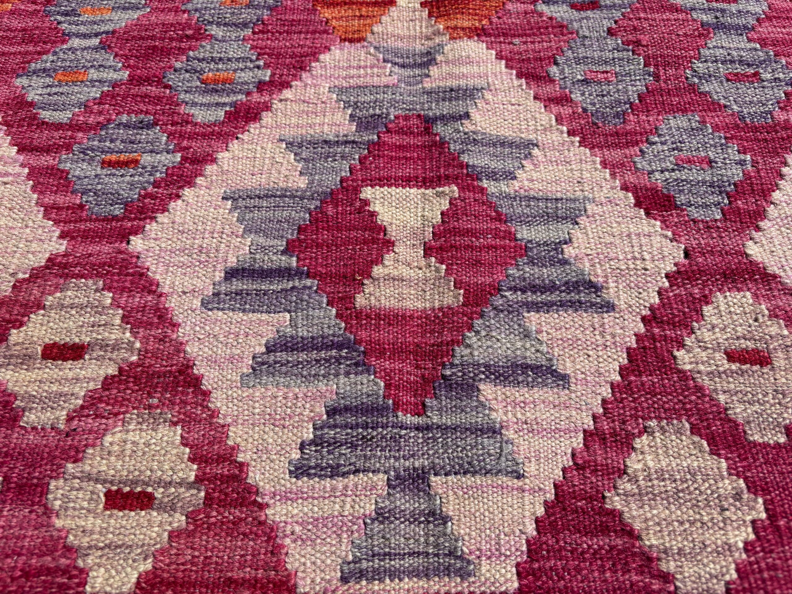 Dieser wunderschöne Kelim stammt aus Afghanistan und wurde in traditioneller Handarbeit gefertigt. Er besteht aus reiner Ghazni-Wolle – einer der hochwertigsten Wollsorten der Region, bekannt für ihre besondere Strapazierfähigkeit und weiche Haptik.